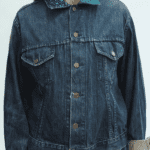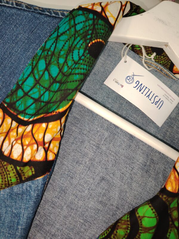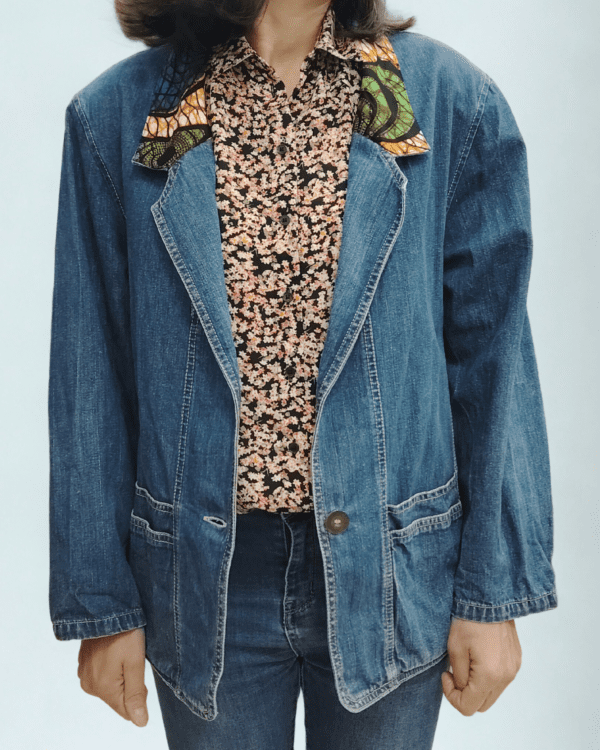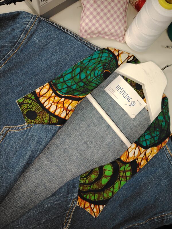 giacca jeans con rifinitura colletto in tessuto wax africano, taglia L.