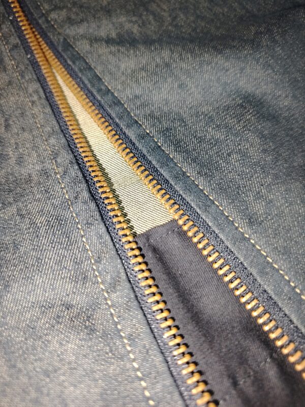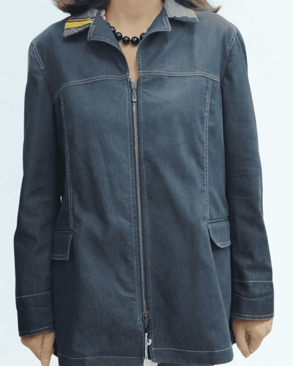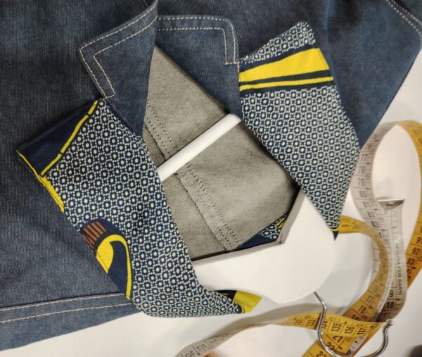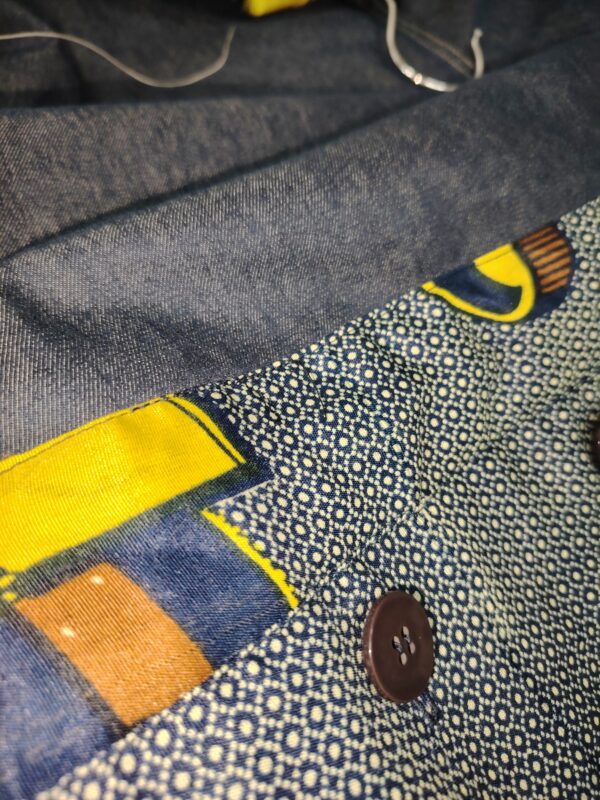 giacca jeans con rifinitura colletto e retro in tessuto wax africano, taglia L.